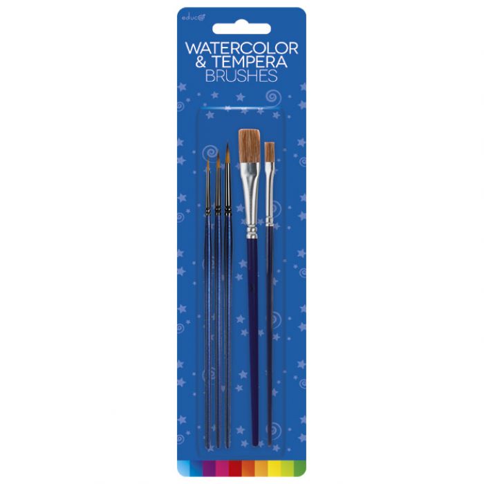 sadrži: 3 kista za vodene boje (2, 4 i 6) i 2 kista za tempere (6 i 10); blister
