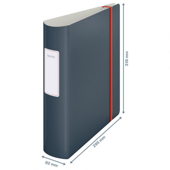 format: A4; zaobljen hrbat sa samoljepljivom etiketom; hrbat: 82 mm; dimenzija: 295x318x82 mm; kapacitet: 500 listova 80 gramskog papira; presvučen obostrano laganim PP/Polyfoam izuzetno izdržljivim materijalom otpornim na ogrebotine (tamno siva boja s vanjske strane, a siva s unutarnje strane); atraktivno zatvaranje s crvenom gumicom; patentirani mehanizam sa polugom koja se otvara za 180° i time omogućuje 50 % šire otvaranje, 20 % brži rad i istovremeno odlaganje na obadvije strane; s unutarnje strane ima: 1 proziran džep za odlaganje i sigurnost ostalih spisa i dokumenata; linija Active Cosy je lagana i ergonomski dizajnirana tako da se može koristiti u pokretu i u uredu; minimalistički dizajn u mat bojama; 5 godina garancije na mehanizam; u pakiranju bez plastike