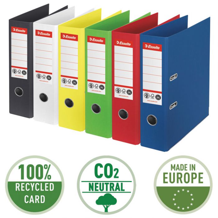 format: A4; kapacitet: 500 listova 80 gramskog papira; hrbat sa samoljepljivom etiketom; izrađen od 100 % recikliranog kartona te je 100 % reciklirajući (CO2 neutral – bez emisije CO2 – nema utjecaja na klimu); metalna šina na donjim rubovima, bočno zatvaranje i rupa za prst na hrptu za jednostavno rukovanje i sigurno skladištenje dokumenata; patentirani mehanizam s izvanrednom silom za dosljedno precizno zatvaranje; zajamčeno pouzdano zatvaranje čak i nakon 10 000 korištenja (3 godine garanicije na mehanizam s GS i LGA certifikatom); ekološki certifikati: Climate Neutral, FSC i Blue Angel; proizveden u Europi