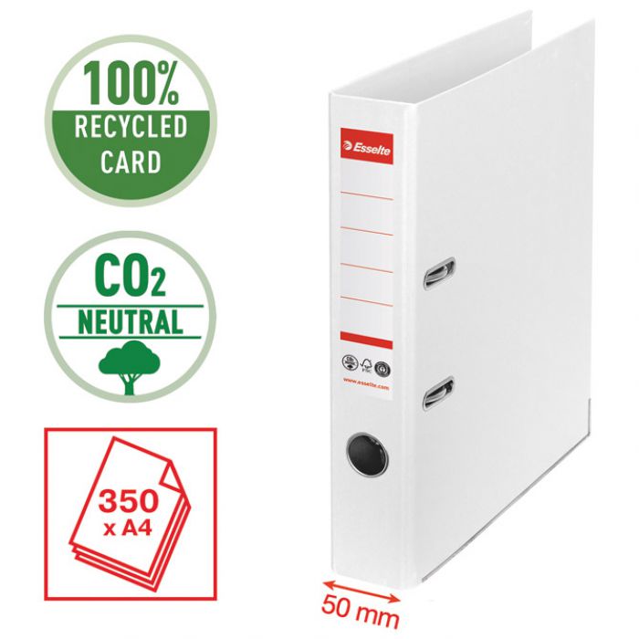 format: A4; kapacitet: 350 listova 80 gramskog papira; hrbat sa samoljepljivom etiketom; izrađen od 100 % recikliranog kartona te je 100 % reciklirajući (CO2 neutral – bez emisije CO2 – nema utjecaja na klimu); metalna šina na donjim rubovima, bočno zatvaranje i rupa za prst na hrptu za jednostavno rukovanje i sigurno skladištenje dokumenata; patentirani mehanizam s izvanrednom silom za dosljedno precizno zatvaranje; zajamčeno pouzdano zatvaranje čak i nakon 10 000 korištenja (3 godine garanicije na mehanizam s GS i LGA certifikatom); ekološki certifikati: Climate Neutral, FSC i Blue Angel; proizveden u Europi