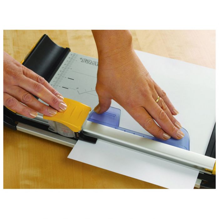 stolni; reže 10 listova 80 gramskog papira; duljina rezanja: 320 mm; ploča plastična s vodičem za rezanje; rezač čelični; SafeCut mehanizam (sa sigurnosnim sustavom koji drži čelični nož u patroni do trenutka rezanja i time jamči maksimalnu sigurnost); dimenzija: 476x128x78 mm; 2 godine garancije