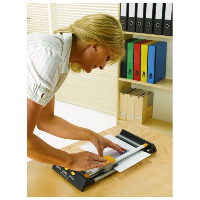stolni; reže 10 listova 80 gramskog papira; ploča aluminijska s vodičem za rezanje; rezač čelični; sa LED pokazivačem koji pokazuje točnu liniju rezanja; sa 4 vrste noževa za: ravno, perforirano, valovito rezanje i presavijanje; 2 godine garancije