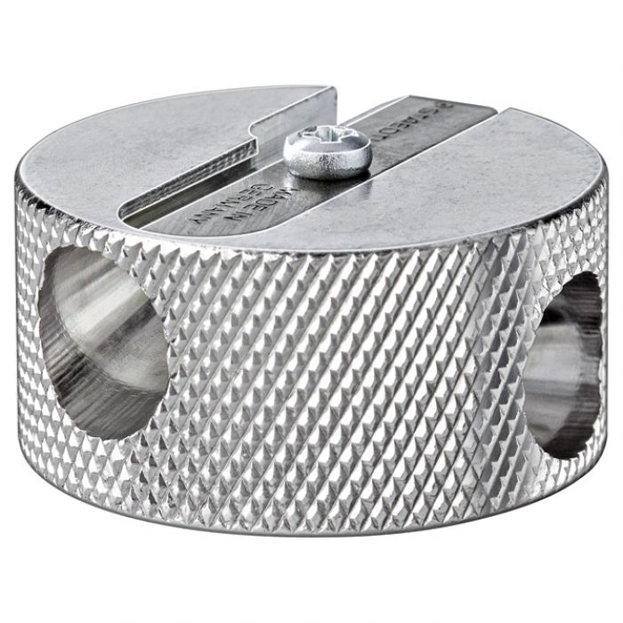metalno; 2 rupe; za olovke standardne debljine do fi: 8,2 mm sa kutom šiljenja od 23° za precizno pisanje (grafitne) i 30° za šire linije (drvene bojice); jako lagano; blister
