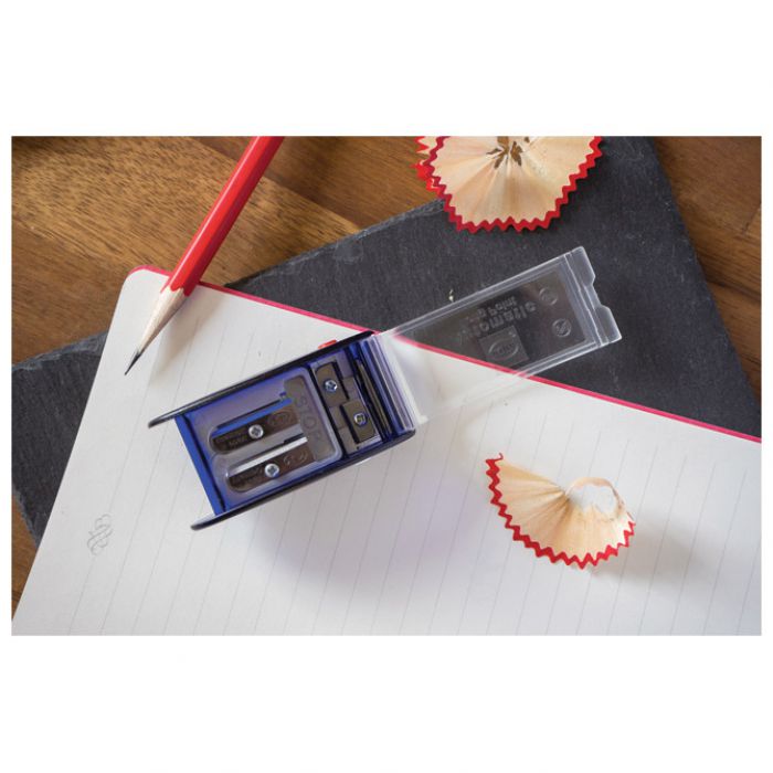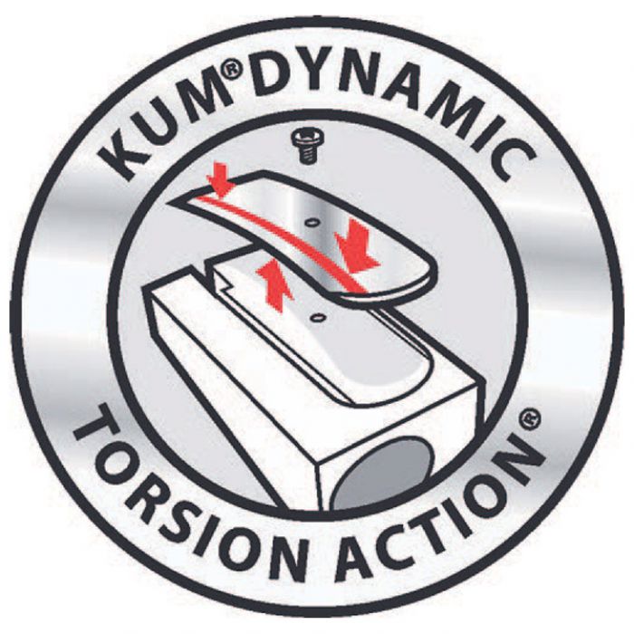 metalno; u PVC kutiji; 4 rupe: 2 rupe su za olovke standardne debljine do fi: 8 mm (broj 1 na šiljilu je mjesto za šiljenje drva gdje se odvaja drvo od mine dok mina ne dođe do Automatic Stop, a broj 2 je za šiljenje mine do kraja; odvojeno šiljenje drva i mine daje vrlo poboljšane performanse), 2 rupe sa bočne strane su za šiljenje mina debljine 2 mm i 3,15 mm; dobiju se dva rezervna noža; precizno šiljilo za sve koji žele dugu i preciznu olovku: tehničare, inženjere, dizajnere, arhitekte, umjetnike i sl.; razlog tome je što nož šilji olovke pod posebno malim kutom a time se može formirati ekstremno dug i tanak vrh pa se sitni detalji i linije mogu lako nacrtati; vrh će ostati oštar dulje vrijeme pa se olovke ne moraju često šiljiti; budući da je vrh iznimno tanak, šiljilo je prikladno samo za visokokvalitetne olovke; automatsko zaustavljanje kontrolira dugačke, fine vrhove olovki i izbjegava nepotrebno trošenje; Dynamic Torsion Action – zakrivljeni nož omogućava neprekidno izvrsno šiljenje i eliminira pucanje mine
