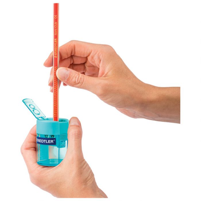 metalno; s PVC kutijom; 2 rupe; za olovke standardne debljine do fi: 8,2 mm sa kutom šiljenja od 23° (grafitne) i 30° (drvene bojice) te Jumbo olovke (grafitne olovke i drvene bojice) debljine do fi: 10,2 mm sa kutom šiljenja od 30°; sigurnosni zatvarač koji sprečava slučajno otvaranje
