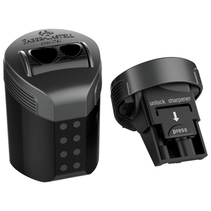 PVC; s PVC kutijom; 2 rupe; izmjenjivi nož; sa sigurnosnim vijkom; visokokvalitetno za jednostavno i čisto šiljenje; ergonomsko; za trokutaste, šesterokutne i okrugle standardne i jumbo olovke (grafitne i drvene bojice); RollOn poklopac sprečava ispadanje otpada; 2 boje: crna i tamno plava