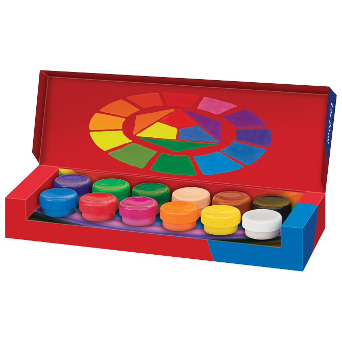 20 ml; plastične čaše; pogodna za za većinu površina; jako pigmentirana neprozirna boja za različite vrste slikarskih tehnika; intenzivne boje postojane na svjetlu; topiva u vodi; kartonska kutija