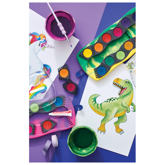 12 boja; fi 24 mm; bijela tempera i list naljepnica; na prozirnom poklopcu je paleta sa 5 bijelih posudica; poklopac se može odvojiti i jednostavno očistiti (spaja se sa dvije kopče); na poklopcu je mjesto za upisivanje imena; svijetle boje s visokom neprozirnošću i mogućnošću pokrivanja; za različite vrste slikarskih tehnika; svaka boja je u svojoj kućici koje se mogu proizvoljno slagati u razne oblike; idealano za bojanje, slaganje i igranje; razvijeno u skladu s najnovijim standardima učenja; PVC kutija