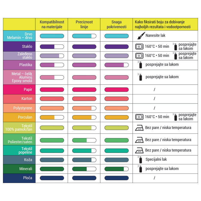 pigmentna tinta na vodenoj bazi; za pisanje i dekoriranje na svjetlom i tamnom papiru i primjena na gotovo svim površinama (plastika, metal, tkanina, staklo…); idealno za kreativne aktivnosti; brzo se suši; visoka otpornost i neprozirnost tinte; velika otpornost vrha; aktiviranje vrha na markeru: protresite 20-ak puta prije upotrebe bez skidanja kapice..aktivirajte vrh tako da ga pritisnete na komad papira dok ne krene puštati tintu; po završetku vratite kapicu a vrh markera okrenite prema gore kad nije u uporabi