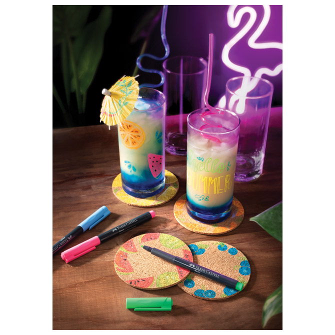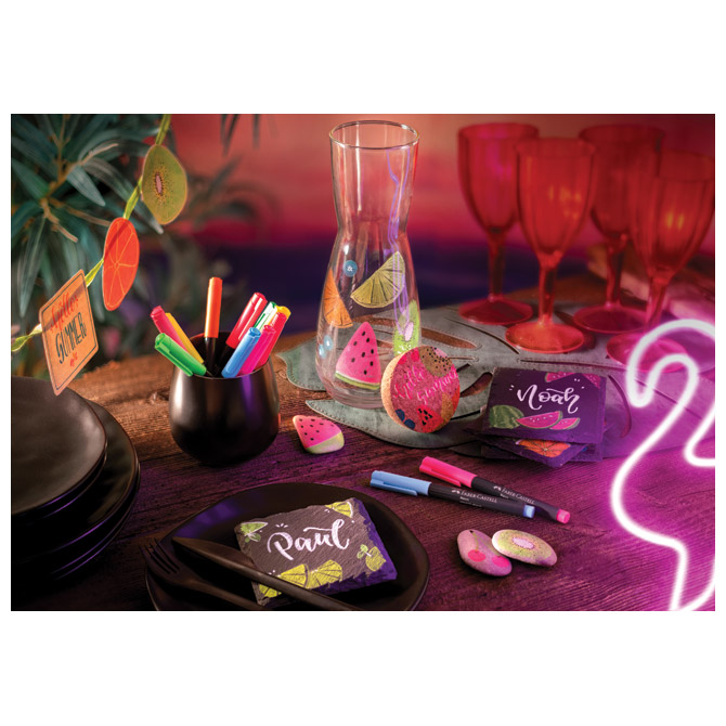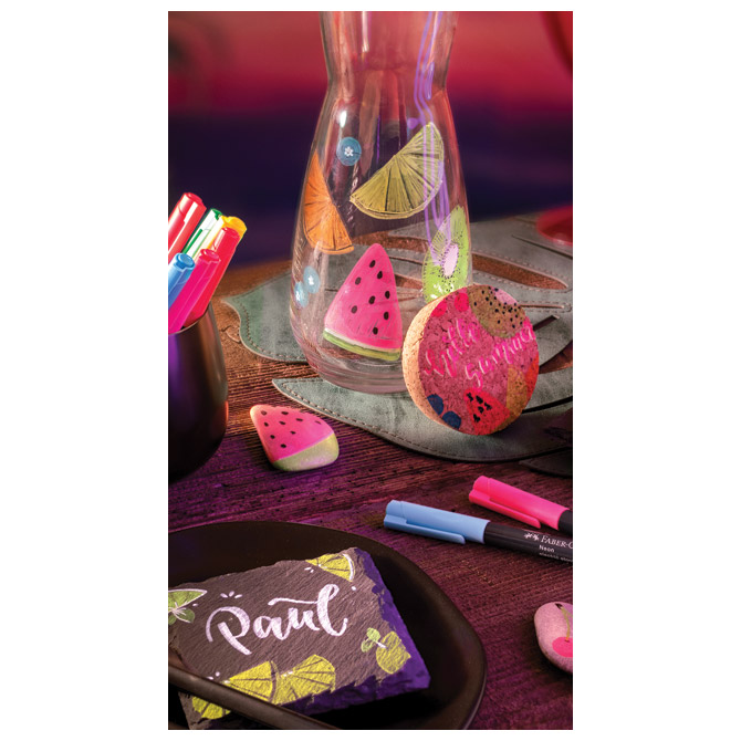 permanentni; okrugli vrh (1,5 mm); širina ispisa 1-2 mm; za: papir, karton, staklo, plastiku, metal, kamen…; nakon 30 minuta u pećnici na 160°C tinta postaje vodootporna (ne prati u perilici posuđa); tinta na bazi vode; tinta ne prolazi kroz papir; bez mirisa; nije potrebno pumpanje ili mućkanje markera; neon efekt; otporan na mrlje; marker čuvati u vodoravnom položaju kad nije u uporabi