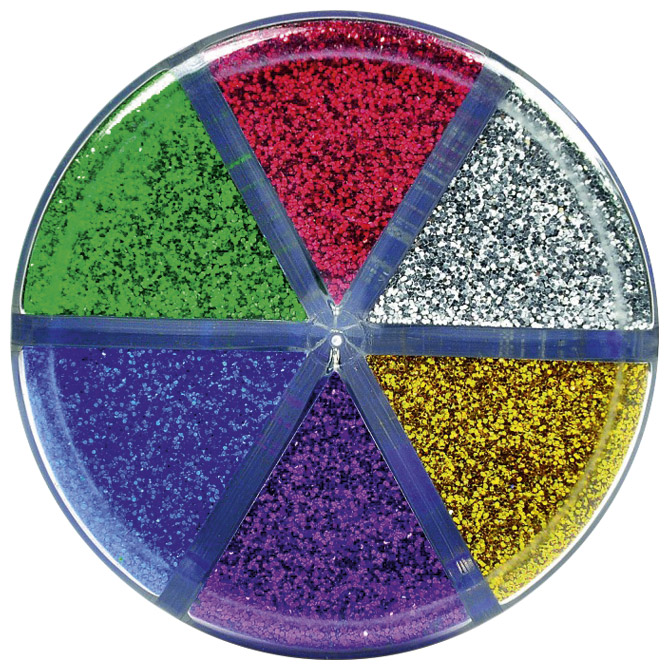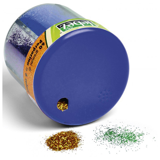 10 g x 6 boja; za ukrašavanje papira, kartona i drugih sličnih materijala; idealno za: dekoriranje (poklona, kutija, staklenki..), izradu čestitki, pozivnica i raznih drugih rukotvorina; sa rupicama za lakše raspršavanje; 6 boja: crvena, ljubičasta, plava, zelena, srebrna i zlatna; set od 6 komada; u PVC čaši