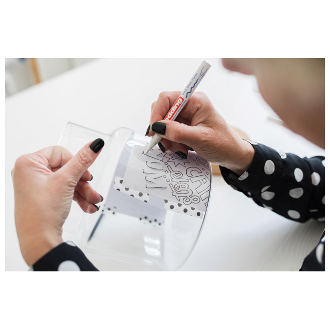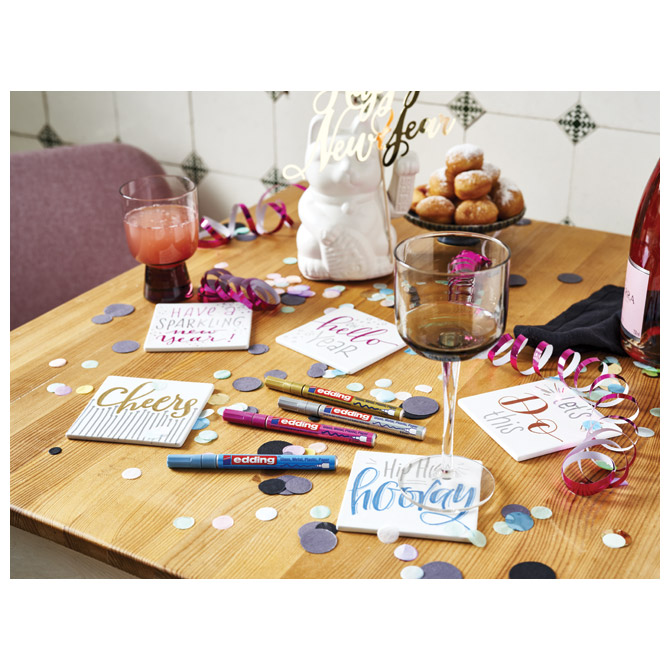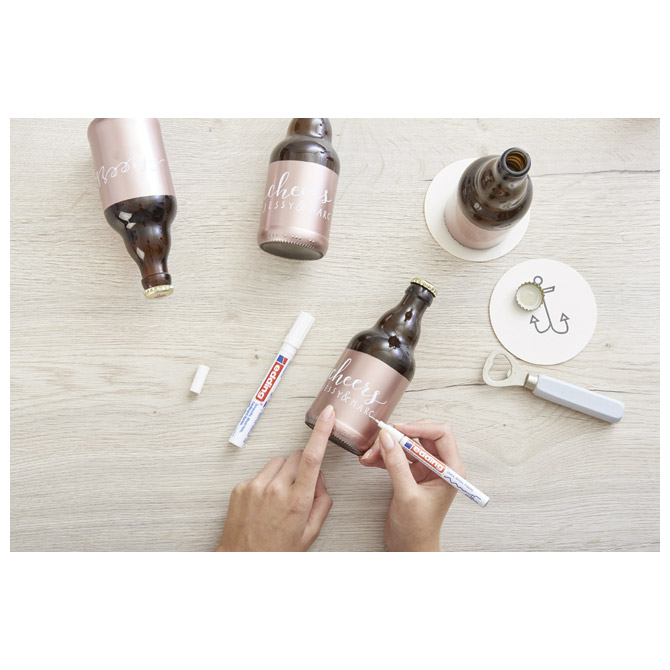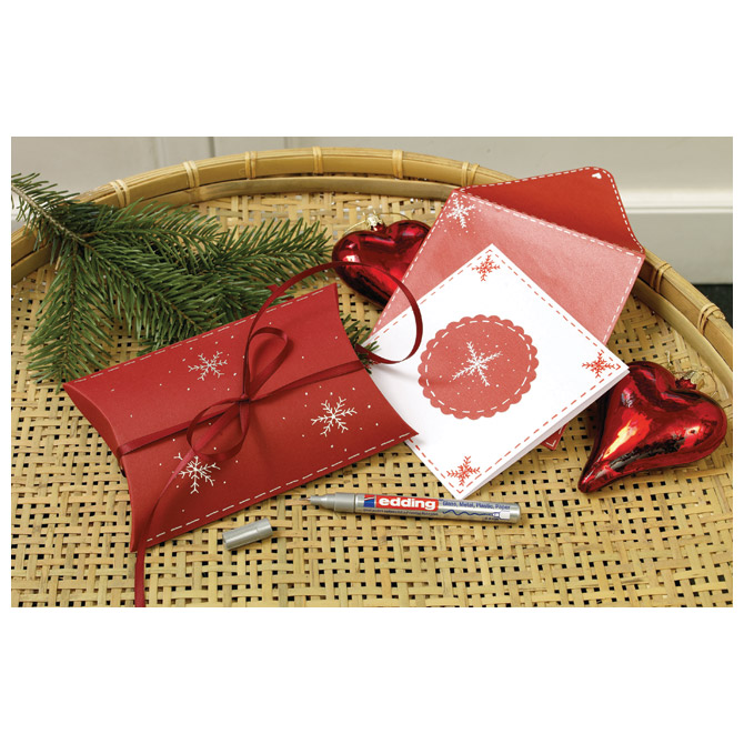 kartonski stalak dimenzije: 20,5×27,2×15,5 cm; sadrži 81 marker: Edding 780 (12 x bijela, 5 x srebrna i 8 x zlatna – širina ispisa 0,8 mm), Edding 751 (12 x bijela, 5 x srebrna i 8 x zlatna – širina ispisa 1-2 mm), Edding 750 (10 x bijela, 4 x srebrna i 7 x zlatna – širina ispisa 2-4 mm) permanentni; lakirajući; sjajni; okrugli vrh; aluminijsko kućište; visoka neprozirnost; ne ostavlja mrlje; za pisanje i dekoriranje na glatkim, tamnim i prozirnim materijalima (npr: staklu, metalu, plastici, papiru s premazom…); brzo se suši; dobro podnosi atmosferske utjecaje; otporan na trošenje (habanje); tinta nema intenzivan miris i Edding 753 s kaligrafskim vrhom (4 x bijela, 3 x srebrna i 3 x zlatna); permanentni; aluminijsko kućište; širina ispisa 1-2,5 mm; vodootporan; za obilježavanje, pisanje i bojanje po gotovo svim materijalima (tamni i transparentni materijali, staklo…); visoka otpornost na: svjetlo, brisanje i vrućinu