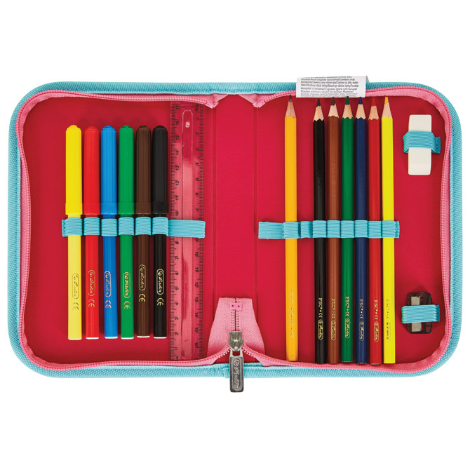 sadrži: torbu školsku (dimenzija: 37x31x22 cm; kapacitet: 15 l; težina: 900 g; anatomska; ergonomski oblikovan leđni dio omogućava protok zraka; podesive naramenice; kopča na klik; 3M reflektirajuće trake; vodootporni materijal; veliki unutarnji pretinac sa posebnim pretincem za knjige; 1 prednji džep; 2 džepa sa strane); vrećicu za tjelesni, pernicu punjenu sa 16 komada pribora i pernicu vrećicu okruglu