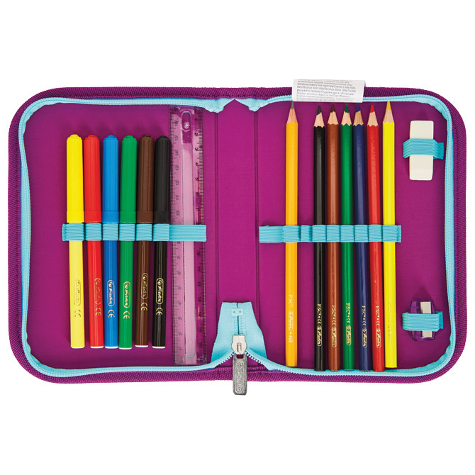 sadrži: torbu školsku (dimenzija: 37x31x22 cm; kapacitet: 15 l; težina: 900 g; anatomska; ergonomski oblikovan leđni dio omogućava protok zraka; podesive naramenice; kopča na klik; 3M reflektirajuće trake; vodootporni materijal; veliki unutarnji pretinac sa posebnim pretincem za knjige; 1 prednji džep; 2 džepa sa strane); vrećicu za tjelesni, pernicu punjenu sa 16 komada pribora i pernicu vrećicu okruglu