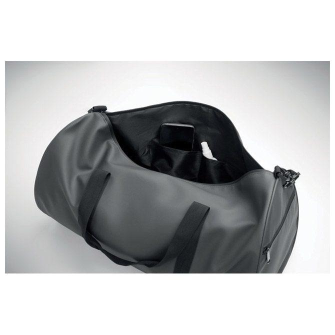 Putna torba od 600D RPET poliestera s PU premazom. Prednji džep s patentnim zatvaračem. Unutarnja podstava od 210D RPET poliestera. 1 bočni pretinac s patentnim zatvaračem / 1 bočni mrežasti pretinac. Unutrašnji džep s patentnim zatvaračem.Dim: 51X28CM
