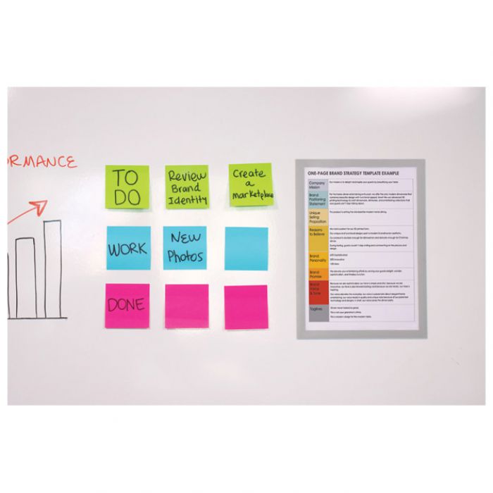 za dokumente; ima 3 magnetne trake straga i kratki bočni otvor; nije UV otporan; prilagođen zaslonima sa magnetskom bijelom pločom; debljina pvc magnetnih traka:1.7mm; unutarnja dimenzija 200×287 mm; proizvedeno u Danskoj