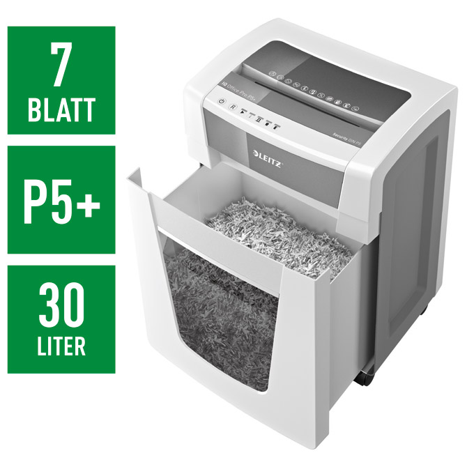 ručnim radom kapacitet: 7 listova (80gsm); kapacitet koša: 30 litara; Cross Cut uništavanje (konfete); širina ulaza: 230 mm; razina sigurnosti: 5; osim papira uništava spajalice 26/6 i 24/6 ili manje; dimenzija: 589x406x320 mm; težina: 14 kg; 2 godine garancije na stroj