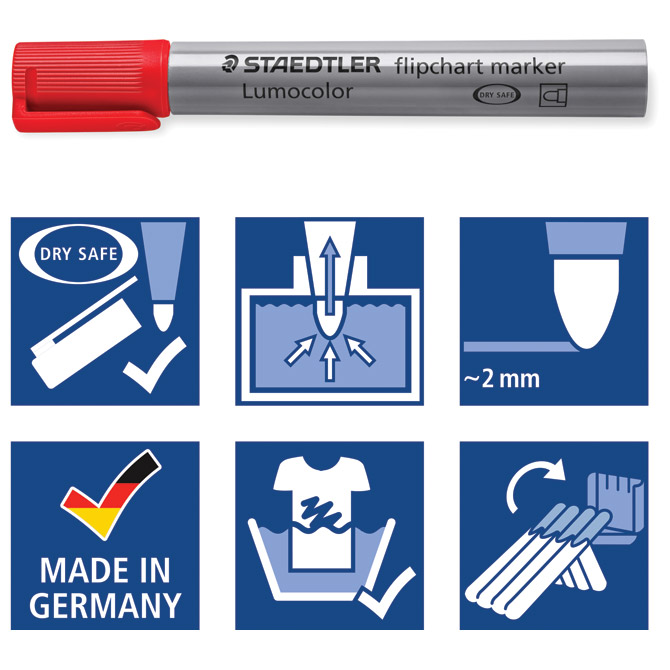 okrugli vrh; širina ispisa 2 mm; spremnik i poklopac PP; tinta na bazi vode; ispire se sa većine tekstila; brzo se suši (pa je pogodan za ljevake); ne razmazuje se; slabog mirisa; idealan za upotrebu na papiru jer boja ne prodire na drugu stranu; može biti nezatvoren danima bez isušivanja (dry safe); siguran rad u zrakoplovu zahvaljujući sustavu za izjednačavanje tlakova koji sprječava istjecanje tinte (airplane safe); ekološka tinta (bez ksilena i toulena); tijelo je izrađeno od 97 % reciklirane plastike