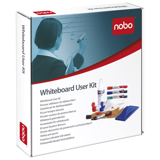 sadrži: magnetni držač, 4 markera (crni, crveni, plavi i zeleni), brisač, refili za brisač, sprej za čišćenje, krpicu od mikrofibre i 10 magneta