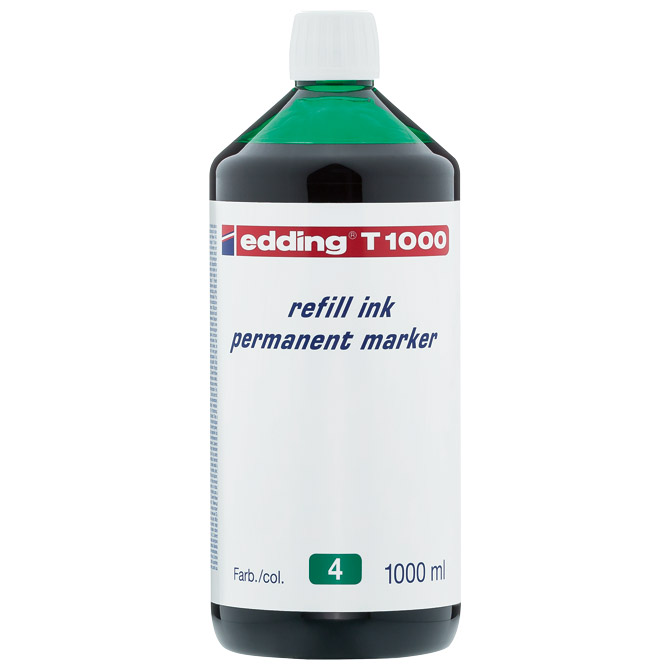 1000 ml; u boci; brzo i jednostavno punjenje; tinta je slabog mirisa, vodootporna, otporna na mrlje, otporna na svjetlo i brzo se suši; bez dodanog ksilena ili toluena; punjenje je ekološki prihvatljivo jer produžuje životni vijek markera i time smanjuje potrošnju materijala; za ponovno punjenje permanentnih markera Edding: 2000, 2000C, 2200, 2200C, Comfort 3, No.1, 400, 500, 550, 800, 850, 370, 390, Ecoline 21, Ecoline 22 i Ecoline 25; prikladna je i za izravno nanošenje kistom, perom, šablonama i žigovima; držite vrh markera prema gore, a zatim jednostavno odvrnite marker između vrha i tijela, ovisno o veličini markera 30 kapi može biti dovoljno za potpuno punjenje tankih modela, a ostali markeri će biti spremni za ponovno pisanje