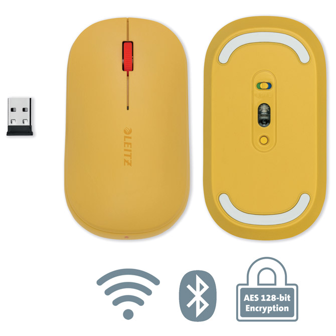 bežični; sa nano prijemnikom; optički (odaberite između 1200, 2400 ili 4000 dpi razina za personalizaciju brzine pokazivača na vašem mišu na visoku za ležerno pregledavanje ili nisku za precizno uređivanje); 2 tipke i kotačić (crveni); tihe tipke; jednako pogodan za ljevake i dešnjake; elegantan, moderan i minimalistički dizajn; omogućuje precizno praćenje čak i na najtežim modernim uredskim površinama kao što su: staklo, granit, lak, mramor i drvo; napajanje: baterija 1 x AA (uključena); dimenzija: 184x105x48 mm; težina: 60 g; prikladno za osobna računala sa ili bez bluetooth funkcije, novije uređaje s bluetooth LE i kompatibilne s Windows, Chrome OS, macOS i Android OS; povežite se s prijenosnim računalom ili mobilnim pametnim uređajem putem bluetooth 3.0 ili 5.0 (bluetooth LE) ili sa stolnim računalom putem 2,4 GHz USB-A Nano ključa; tehnologija enkripcije državne razine koja zadovoljava korporativne sigurnosne protokole i štiti vaše podatke od potencijalnih hakera; u kartonskoj kutiji