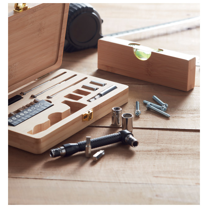 sadrži 21 dio: 3 odvijača, 10 bitova u držaču, 3 veličine s prorezima, 3 Torx veličine i 1 adapter, 4 ključa, 1 rezač, 1 ručku i 1 konektor; dimenzija: 19 ,5×11,8×3 cm; u kućištu od bambusa prirodnog izgleda
