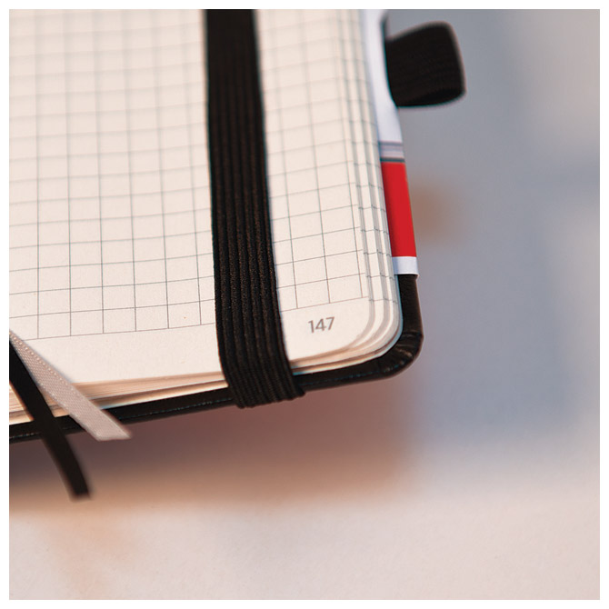 96 listova, šamoa; 80 g/m2; visokokvalitetan papir kroz koji ne prolazi tinta; s gumicom (crna), 2 označivača, mjesto za olovku, 2 etikete, 1 etiketa za ime, zastavice i džep na zadnjoj korici; stranice su numerirane; zadnjih 8 listova je perforirano; tvrde korice sa zaobljenim rubovima