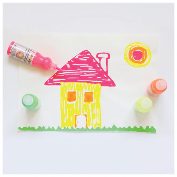 visokokvalitetna boja za plakat spremna za upotrebu; u ergonomskoj bočici s mlaznicom za kontrolu protoka za doziranje boje sa velikom preciznošću prije nego što se upotrijebi kist; omogućuje stvaranje neprozirnih nijansi boja i u slojevima nakon što se potpuno osuši; trag boje nakon poteza s kistom je jednolik s izvrsnim rezultatima u svjetlini i intenzitetu; može se koristiti na različitim površinama kao što su: papir, karton, drvo i tkanina; može se fiksirati lakom ili drugim prikladnim proizvodom; može se koristiti zajedno sa proizvodima na bazi vode; mrlje treba odmah ukloniti; kartonska kutija; Kreativni prijedlog: Uzmite gusti, grubi ili glatki, obojeni ili bijeli karton i dozirajte jednu za drugom, jednu u drugu, bez miješanja boja; dobit ćete preklapajuće i koncentrične slojeve različitih boja; zatim “povucite boju” u različitim smjerovima pomoću čačkalice ili bilo kojeg predmeta sa šiljastim krajem; dobit ćete fantastične i iznenađujuće efekte tipične za pravog umjetnika!