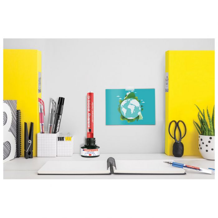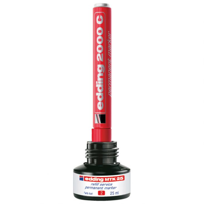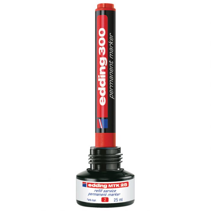 25 ml; u bočici s kapilarnim sustavom punjenja; sigurno i jednostavno punjenje; tinta je slabog mirisa, vodootporna, otporna na mrlje, otporna na svjetlo i brzo se suši; bez dodanog ksilena ili toluena; punjenje je ekološki prihvatljivo jer produžuje životni vijek markera i time smanjuje potrošnju materijala; za ponovno punjenje permanentnih markera Edding: 2000, 2000C, 2200, 2200C, No.1, 300, 330, 370, 400, Ecoline 21, Ecoline 22 i Ecoline 25; jednostavno ostavite marker vrhom prema dolje u bočici za punjenje najmanje sat vremena ili idealno preko noći i marker je ponovno spreman za pisanje