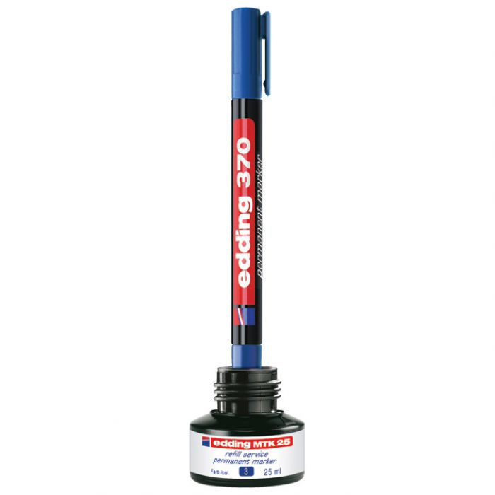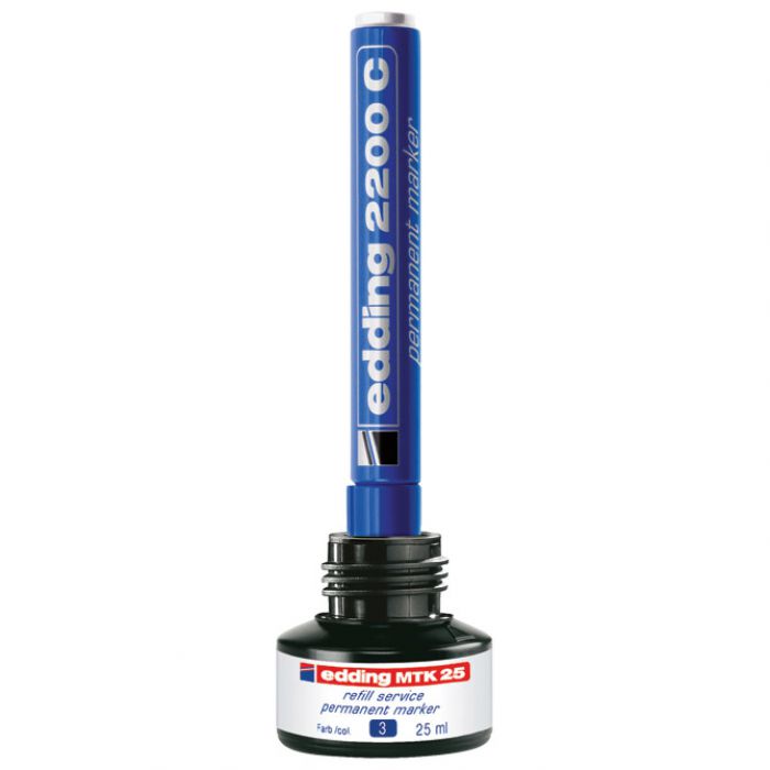 25 ml; u bočici s kapilarnim sustavom punjenja; sigurno i jednostavno punjenje; tinta je slabog mirisa, vodootporna, otporna na mrlje, otporna na svjetlo i brzo se suši; bez dodanog ksilena ili toluena; punjenje je ekološki prihvatljivo jer produžuje životni vijek markera i time smanjuje potrošnju materijala; za ponovno punjenje permanentnih markera Edding: 2000, 2000C, 2200, 2200C, No.1, 300, 330, 370, 400, Ecoline 21, Ecoline 22 i Ecoline 25; jednostavno ostavite marker vrhom prema dolje u bočici za punjenje najmanje sat vremena ili idealno preko noći i marker je ponovno spreman za pisanje