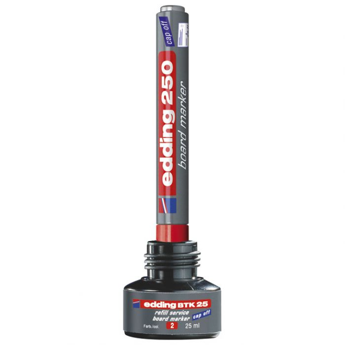 25 ml; u bočici s kapilarnim sustavom punjenja; sigurno i jednostavno punjenje; tinta je slabog mirisa, otporna na svjetlo i brzo se suši; bez dodanog butil acetata; punjenje je ekološki prihvatljivo jer produžuje životni vijek markera i time smanjuje potrošnju materijala; za ponovno punjenje markera za bijelu ploču Edding: Comfort 2, 250, 360, 361, 363, Ecoline 28 i Ecoline 29; jednostavno ostavite marker vrhom prema dolje u bočici za punjenje najmanje sat vremena ili idealno preko noći i marker je ponovno spreman za pisanje