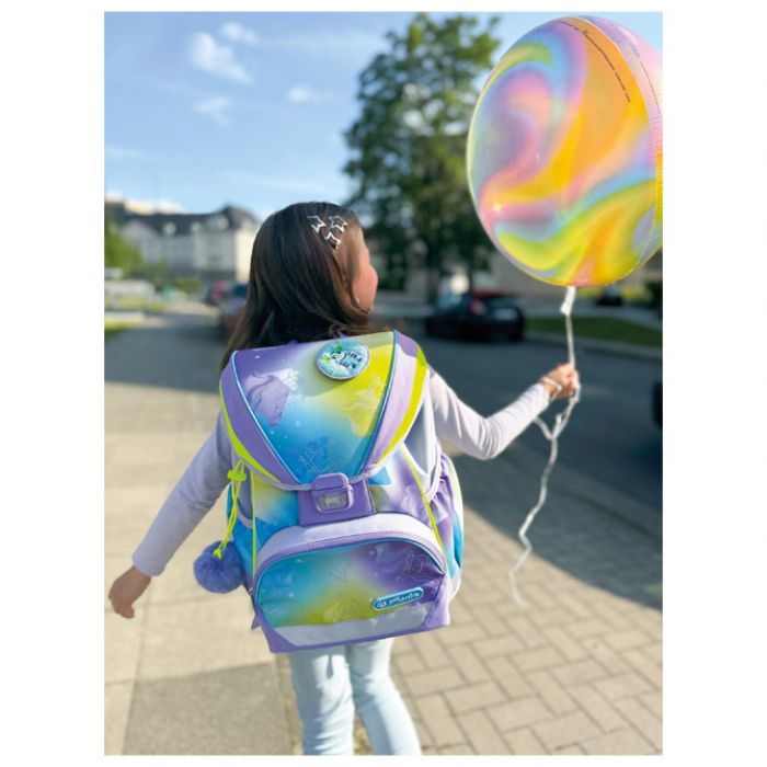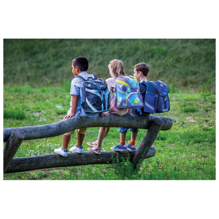 sadrži: torbu školsku; iznimno lagana; dimenzija: 32x39x25 cm; težina: 800 g; kapacitet: 22 l; anatomska; ergonomski oblikovan leđni dio s mrežastom tkaninom za maksimalan protok zraka; podesive naramenice; kopča na klik reflektirajuća; visinski podesivi prsni remen; stabilna donja ploča; reflektirajući materijalil; džepić na zip s prednje strane; džepovi na bočnim stranama; na poklopcu ima motiv na čičak koji se može ukloniti; vrećicu za tjelesni, pernicu praznu 1 zip 2 preklopa za 16 komada pribora i pernicu vrećicu okruglu