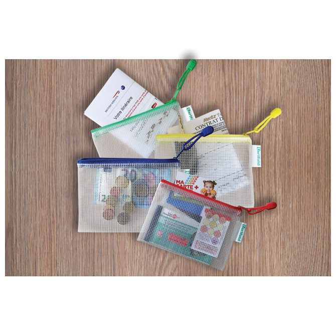 izrađen od iznimno otpornog ojačanog PVC-a; sa zatvaranjem na zip (metalni, zatvarač je konop s plastičnim nastavkom); debljina: 230 mikrona; Tarifold etiketa s vanjske bočne strane može se koristiti kao držač za olovku; idealan za nošenje i zaštitu dokumenata, uzoraka, malih predmeta, uredskog i školskog pribora i sl.; proziran etui s bijelom mrežastom podstavom omogućava pregled i lako prepoznavanje sadržaja; zip u 4 boje: crvena, plava zelena i žuta