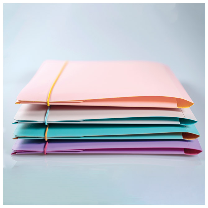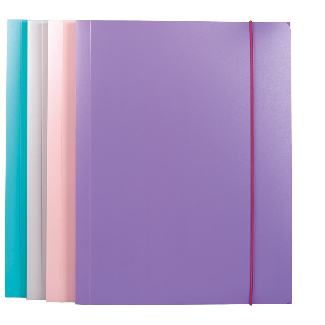 format: A4; debljina 0,6 mm PP; set od 4 komada; 3 klape i gumica omogućuju sigurnost dokumenata i elastično zatvaranje; paket također uključuje 4 dodatne elastične gumice za prilagođavanje korisniku; neuništiv; 100 % reciklirajući; otporan na vlagu; dvobojan (iznutra/izvana): ljubičasta/fuksija, svijetloplava/pijesak, akvamarin/narančasta i ružičasto/žuta