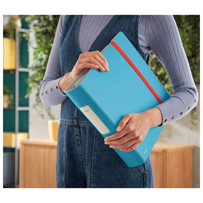 format: A4; zaobljen hrbat sa samoljepljivom etiketom; hrbat: 82 mm; dimenzija: 295x318x82 mm; kapacitet: 500 listova 80 gramskog papira; presvučen obostrano laganim PP/Polyfoam izuzetno izdržljivim materijalom otpornim na ogrebotine (plava boja s vanjske strane, a siva s unutarnje strane); atraktivno zatvaranje s crvenom gumicom; patentirani mehanizam sa polugom koja se otvara za 180° i time omogućuje 50 % šire otvaranje, 20 % brži rad i istovremeno odlaganje na obadvije strane; s unutarnje strane ima: 1 proziran džep za odlaganje i sigurnost ostalih spisa i dokumenata; linija Active Cosy je lagana i ergonomski dizajnirana tako da se može koristiti u pokretu i u uredu; minimalistički dizajn u mat bojama; 5 godina garancije na mehanizam; u pakiranju bez plastike