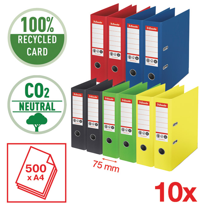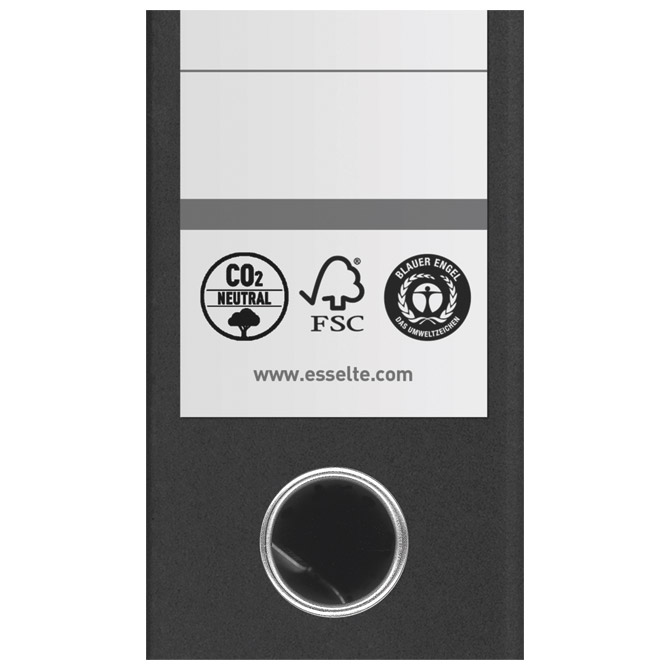 format: A4; kapacitet: 500 listova 80 gramskog papira; hrbat sa samoljepljivom etiketom; izrađen od 100 % recikliranog kartona te je 100 % reciklirajući (CO2 neutral – bez emisije CO2 – nema utjecaja na klimu); metalna šina na donjim rubovima, bočno zatvaranje i rupa za prst na hrptu za jednostavno rukovanje i sigurno skladištenje dokumenata; patentirani mehanizam s izvanrednom silom za dosljedno precizno zatvaranje; zajamčeno pouzdano zatvaranje čak i nakon 10 000 korištenja (3 godine garanicije na mehanizam s GS i LGA certifikatom); ekološki certifikati: Climate Neutral, FSC i Blue Angel; proizveden u Europi