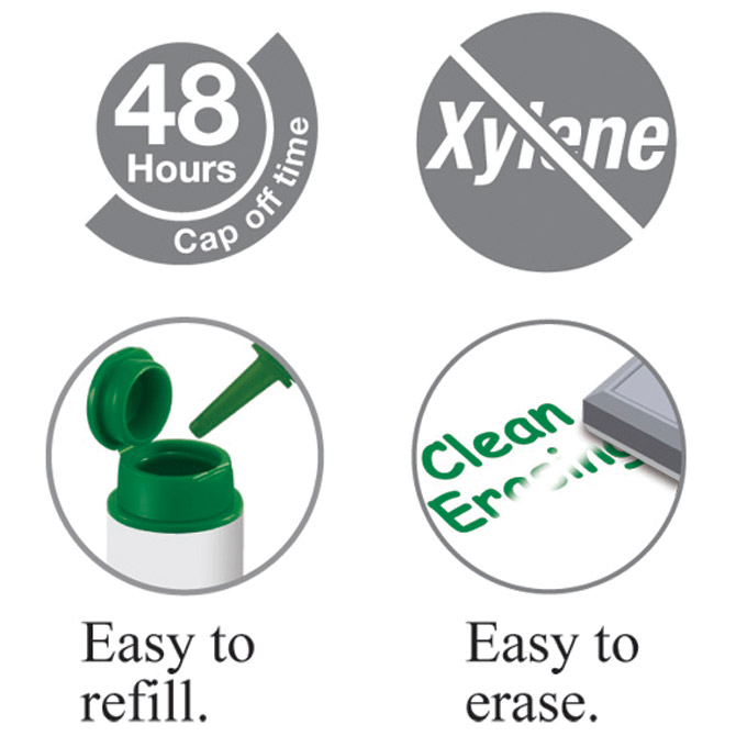 nepermanentni; brzo se suši; lako se briše sa glatkih površina; za pisanje po bijeloj ploči i glatkim površinama; može biti bez poklopca 48sati