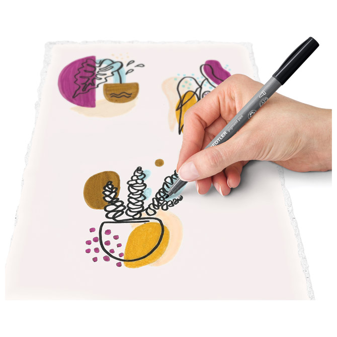 sadrži: 6 x pigment brush 371 u različitim bojama + 1 x pigment pen 376 u intenzivnoj crnoj boji + 1 x olovka grafitna Mars Lumograph 100-2B + 1 x šiljilo 510 10 + 1 x gumica Art 526 B30-9C; set je idealan za upoznavanje modernog stilskog crtanja “Line Art” u bojama inspiriranim botanikom; grafitna olovka napravljena od certificiranog drva; kućište napravljeno od 97 % reciklirane plastike prema ISO 14021 standardu (tijelo, vrh i poklopac – pigmentni asortiman); olovke držati vodoravno; kartonska kutija s vješalicom i prozorom za preglednost proizvoda