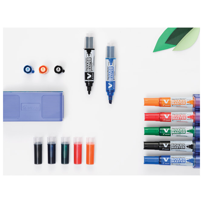 sadrži: 10 markera za bijelu ploču (nepermanentni; okrugli vrh; širina ispisa 2,3 mm; promjer 6 mm; razina tinte je vidljiva; intenzivne i sjajne boje vidljive sa većih udaljenosti; sa tekućom pigmentnom tintom i mogućnošću zamjene uloška sa tintom (refil: WBS-VBM); Begreen – 91 % izrađen od recikliranih materijala (izuzev zamjenjivih dijelova))