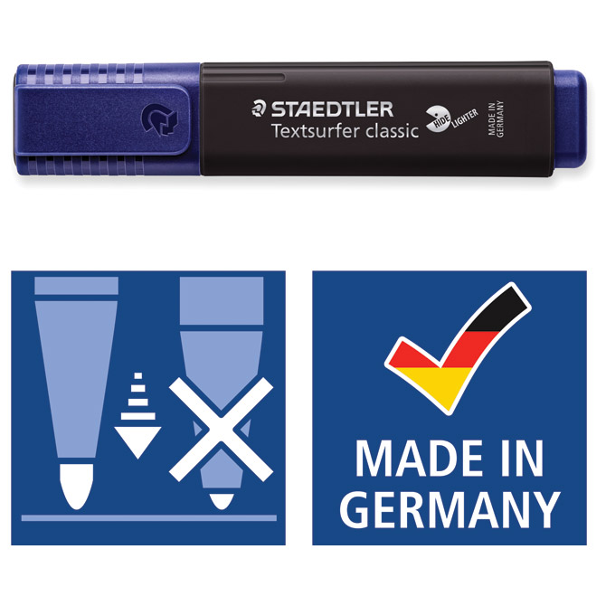klinasti vrh; širina ispisa 1-5 mm; spremnik i poklopac PP; signir sa velikim spremnikom za tintu; tinta na bazi vode; za papir, faks i fotokopije; boje se ne razmazuju na ink jet ispisima; brzo se suši; ultra mekan; okretni poklopac za lako otvaranje; siguran rad u zrakoplovu zahvaljujući sustavu za izjednačavanje tlakova koji sprječava istjecanje tinte (airplane safe); crni signir prekriva tekst i retke, no oni i dalje ostaju čitljivi, ali su nakon kopiranja nečitljivi