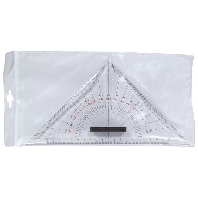 nautički; s držačem; jednakokračni trokut za crtanje sa kutovima 45°; od prozirnog plastičnog materijala; sa mjernom skalom (podjela po 1 mm); duljina hipotenuze: 26 cm