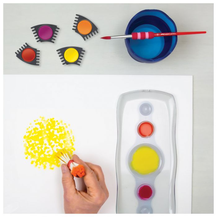 fi 24 mm; na prozirnom poklopcu je paleta sa 5 bijelih posudica; poklopac se može odvojiti i jednostavno očistiti (spaja se sa dvije kopče); na poklopcu je mjesto za upisivanje imena; svijetle boje s visokom neprozirnošću i mogućnošću pokrivanja; za različite vrste slikarskih tehnika; svaka boja je u svojoj kućici koje se mogu proizvoljno slagati u razne oblike; idealano za bojanje, slaganje i igranje; razvijeno u skladu s najnovijim standardima učenja; PVC kutija