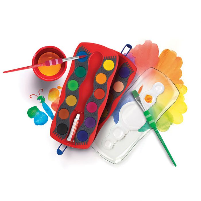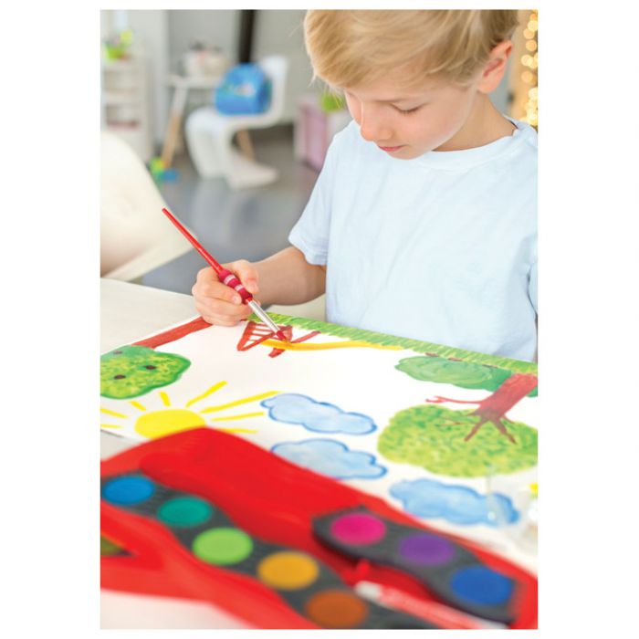 fi 24 mm; na prozirnom poklopcu je paleta sa 5 bijelih posudica; poklopac se može odvojiti i jednostavno očistiti (spaja se sa dvije kopče); na poklopcu je mjesto za upisivanje imena; svijetle boje s visokom neprozirnošću i mogućnošću pokrivanja; za različite vrste slikarskih tehnika; svaka boja je u svojoj kućici koje se mogu proizvoljno slagati u razne oblike; idealano za bojanje, slaganje i igranje; razvijeno u skladu s najnovijim standardima učenja; PVC kutija