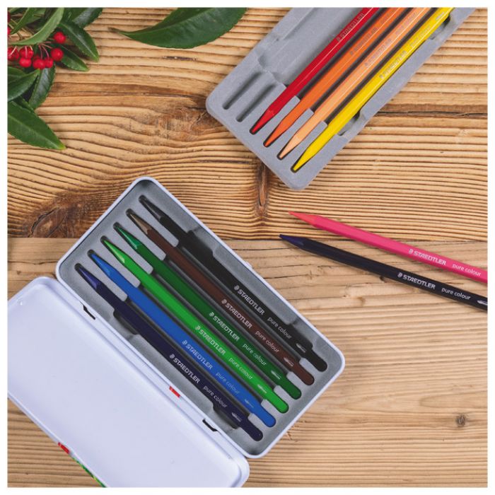 šiljene; šesterokutne; promjer olovke/mine: 7 mm; duljina olovke/mine: 14,5 cm; za: Aquarelle papir (od 250 g/m2 i više); lako se šilje standardnim šiljilom; sa akvarel jezgrom (cijela boja je vodena – nema drveni vanjski dio); površina olovke je lakirana kako bi ruke ostale čiste; brojne mogućnosti bojanja sa kistom i vodom; za crtanje na crnom i bijelom papiru; puna mina je idealna za izradu velikih skica te sjenčanje širih površina; set od 12 boja; metalna kutija; blister