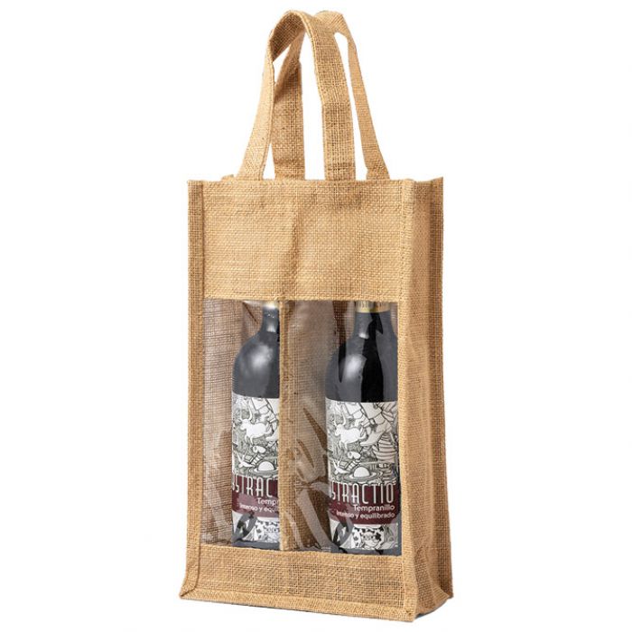 Otporna laminirana jutana vrećica s pojedinačnim pretincem za 2 boce vina od 75 cl. Prozirni prozorčić, ojačane ručke i paspul.