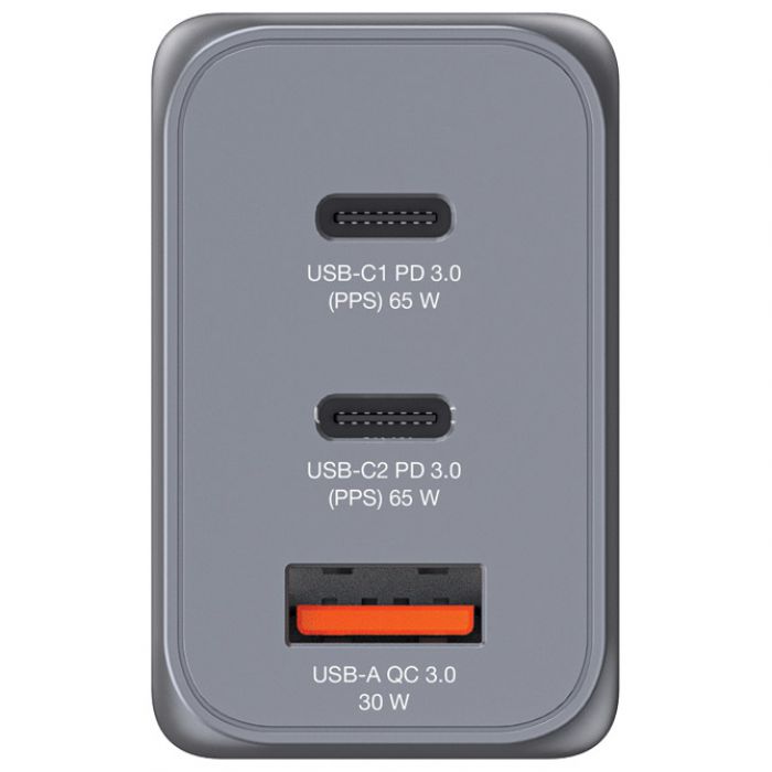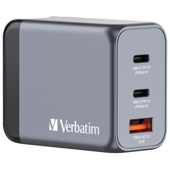 Verbatimov 65W GaN zidni punjač kombinira dva USB-C PD 65W priključka i jedan USB-A QC 3.0 priključak u elegantnom dizajnu veličine dlana. Idealan za ured, dom ili putovanje za napajanje vašeg prijenosnog računala, tableta, pametnog telefona, uređaja za igranje i još mnogo toga.